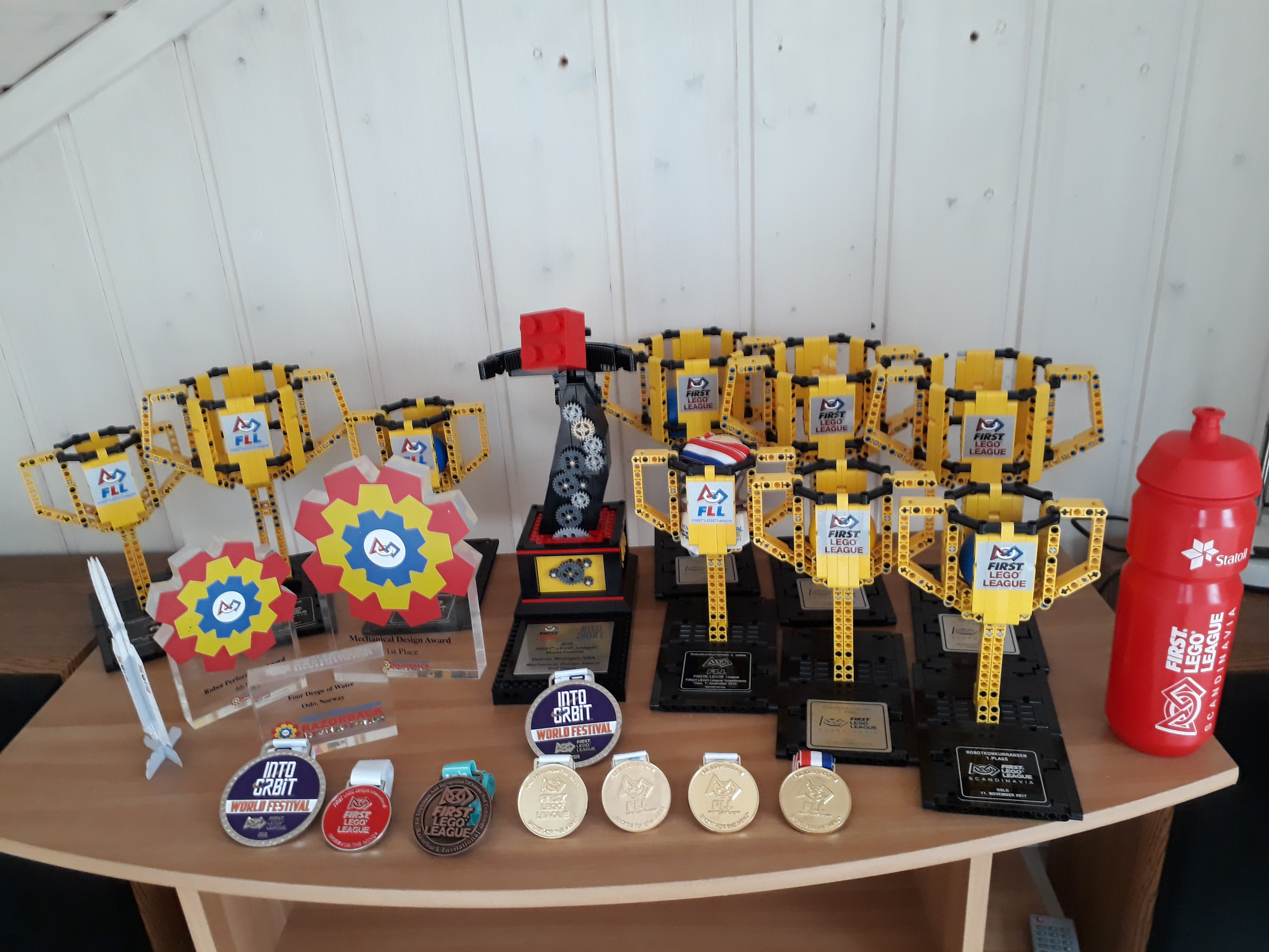Trykk her for å se et nærbilde av pokalen vi vant i VM. Under er et bilde av nesten alle prisene vi har vunnet (et eldre lagmedlem har en teknologipris fra Oslo-mesterskapet. Her er en oversikt;